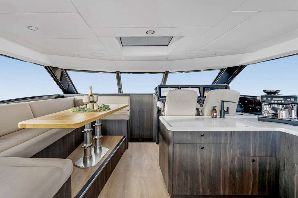 -Cockpit has forward facing coaching, Shower/toilet port, Salt and Fresh taps, Electric slide down window that opens bulkhead connecting to AFT Galley, Engine room access via Port/STB cockpit, Engine controls and docking system controls cockpit STB, overhead speakers and Led’s