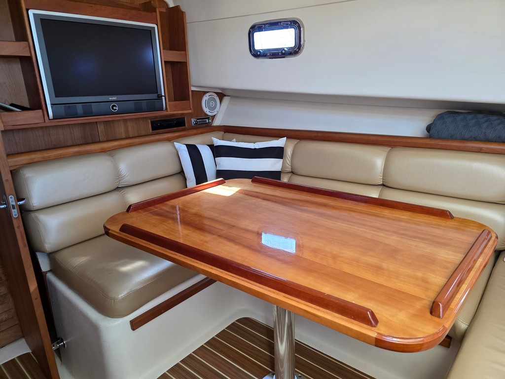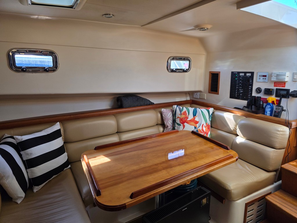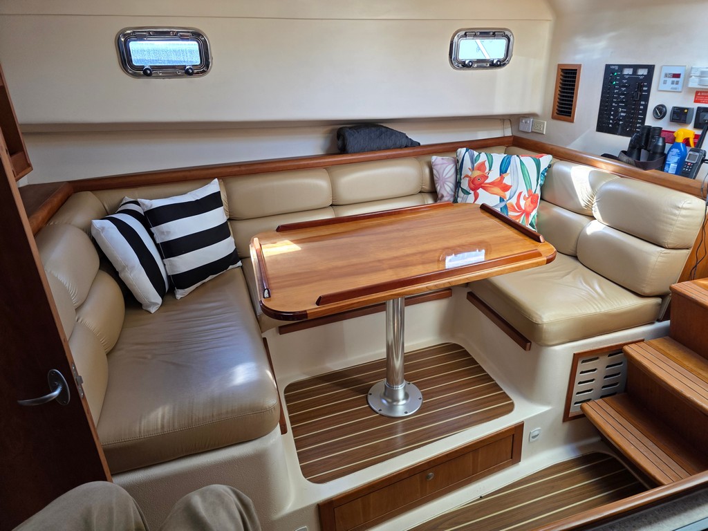 -Helm area inc Port/STB coaching + Double Helm and Companion seating, Timber removable table, glassed front and side sliding windows